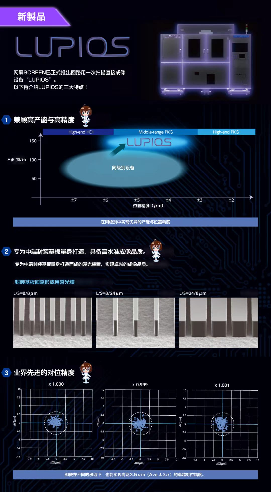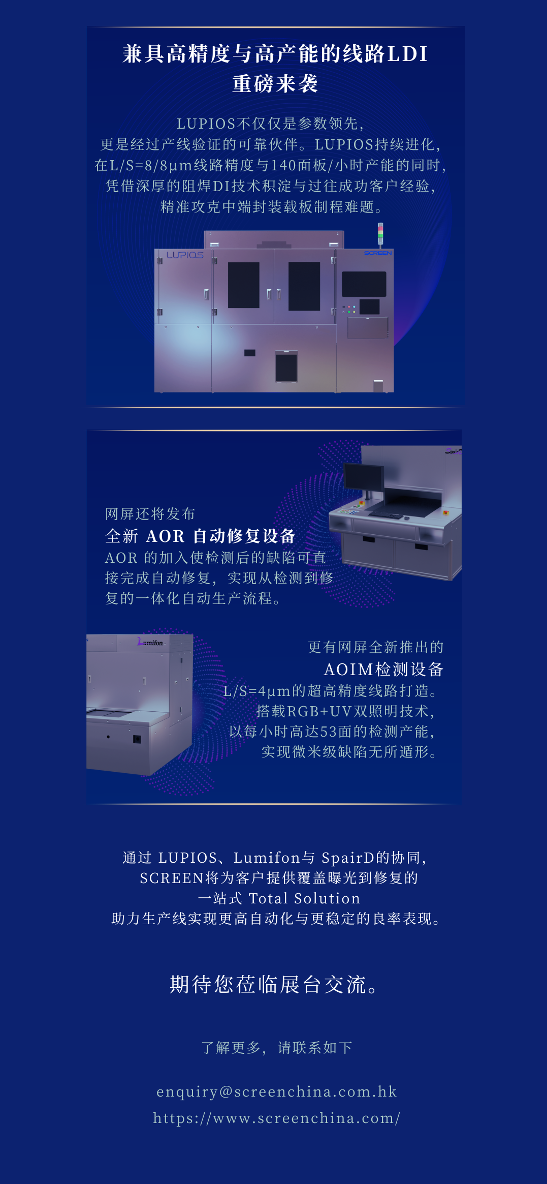 全新DI解决方案震撼登場!网屏(中国)将出展2025 HKPCA Show深圳展览会,为您带来最新线路DI设备LUPIOS 以及多方位印刷电路板解决方案,呈现行业尖端技术! LUPIOS支持L/S=8/8μm的线路精度,并最高能实现每小时140面板的产能。LUPIOS通过丰富的阻焊DI经验,能有效解决了中端封装载板难题,助力生产线实现效能跃升!期待您莅临展台交流。